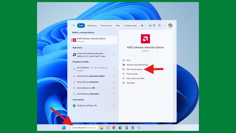 Na busca do Windows, pesquise por “AMD Software”. Em seguida, clique com o botão direito do mouse no programa e depois em “Abrir local do arquivo”.