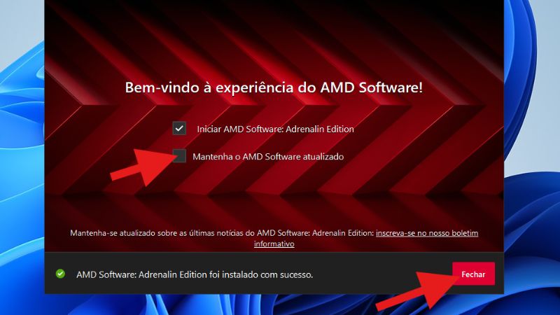 Nesta tela, deixe a opção “Iniciar AMD Software: Adrenalin Edition” marcada e a opção “Mantenha o AMD Software atualizado” desmarcada. Em seguida, clique em “Fechar”.