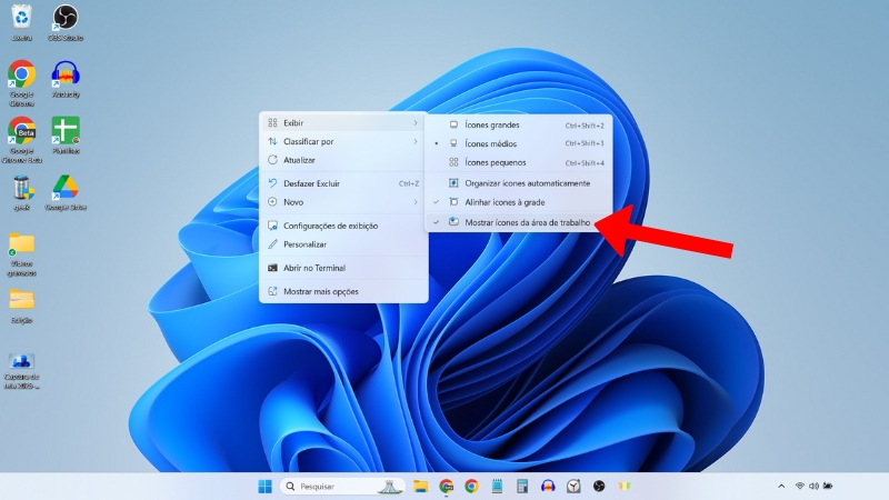 Dessa forma, todos os ícones serão ocultos. No entanto, caso um dia você queira voltar a exibi-los, basta marcar Mostrar ícones da área de trabalho.