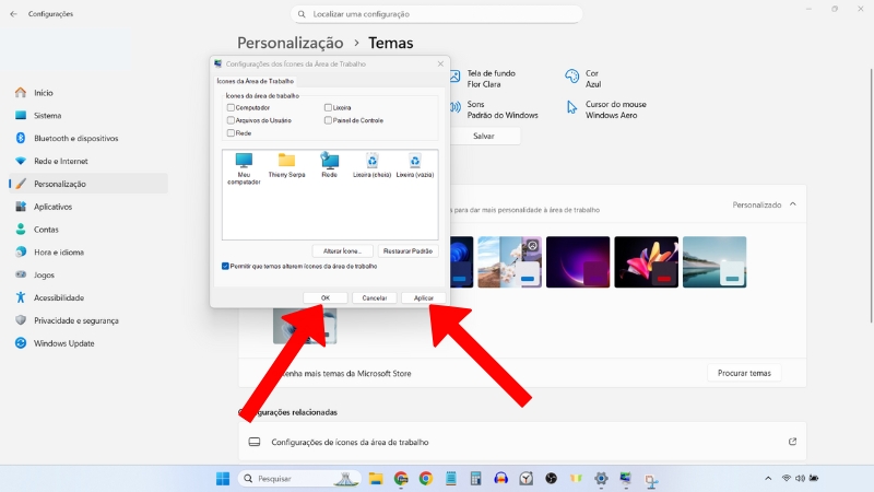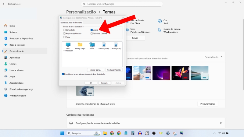 Para a Lixeira voltar a aparecer na sua área de trabalho, basta seguir os mesmos passos para ocultá-la. Só que agora, ao invés de desmarcar a caixinha da Lixeira, você vai marcá-la. Em seguida, basta clicar em Aplicar e OK.